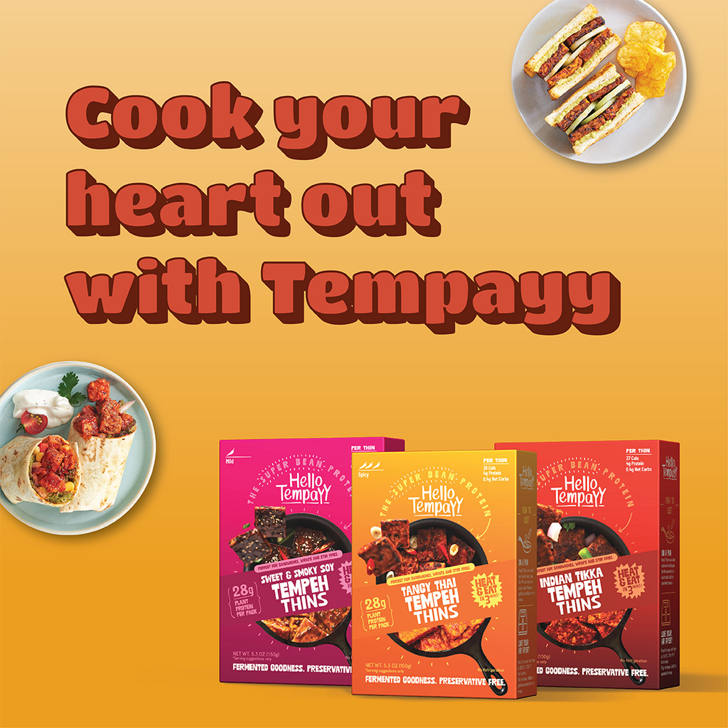 Tempeh is a versatile product and can be added to your favourite dishes easily as it takes well to all flavours. It can be used as cubes or mince, marinated/ seasoned, and sauteed. Use it in curries, stir-fries, sandwiches, tacos, salads, or any of the recipes available at Hello Tempayy.