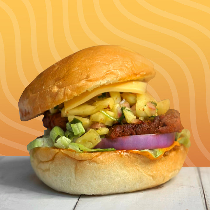 Spread a generous layer of tandoori mayonnaise on the buns. Add a layer of chopped lettuce, 2 onion rings, and 2 Tangy Thai Tempeh Thins. Top with a spoonful of pineapple salsa and a slice of cheese. Close the bun and enjoy!