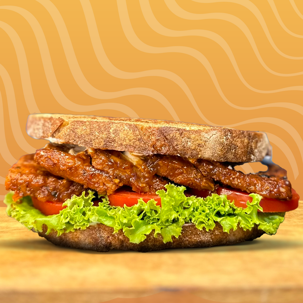 Place the pre-marinated Tempeh Thins on top of the tomato slices. Close the sandwich with the remaining bread slice.